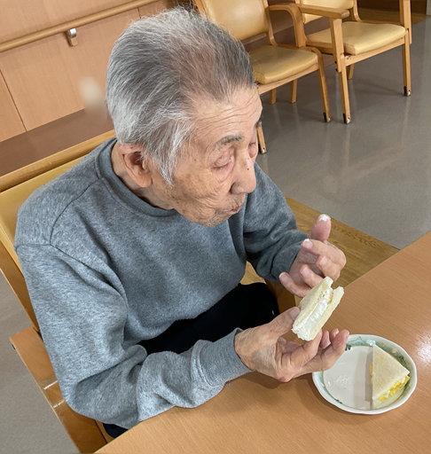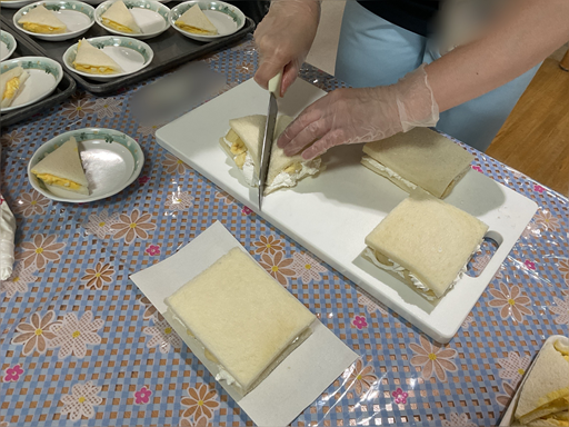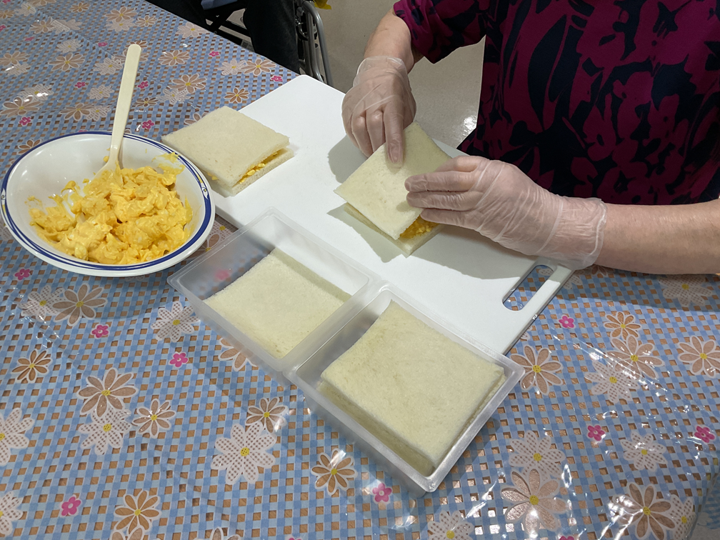 今回、「サンドイッチが食べたい!」という利用者さんからのご希望にお答えし、3階ユニットでは卵サンドとバナナホイップ、2種類のサンドイッチを作りました!