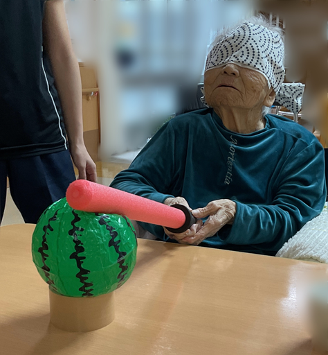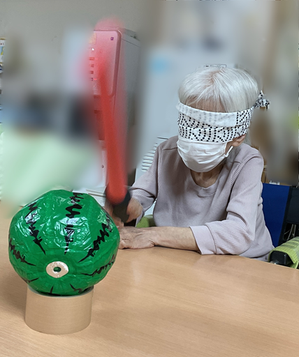 周りの応援を頼りに、スイカ型の風船に狙いを定め棒を振り下ろします!