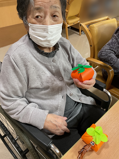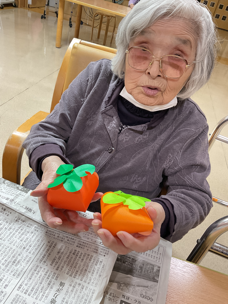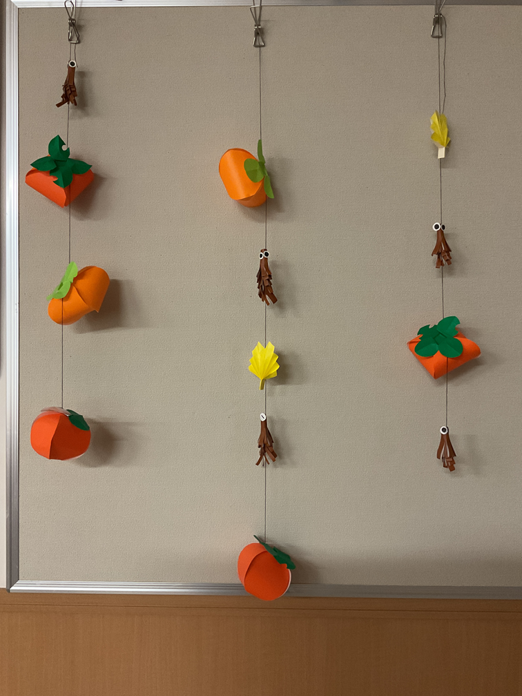 吊るし柿をイメージした飾りを利用者さんにお手伝いいただきながら、折り紙を使って作成しました!