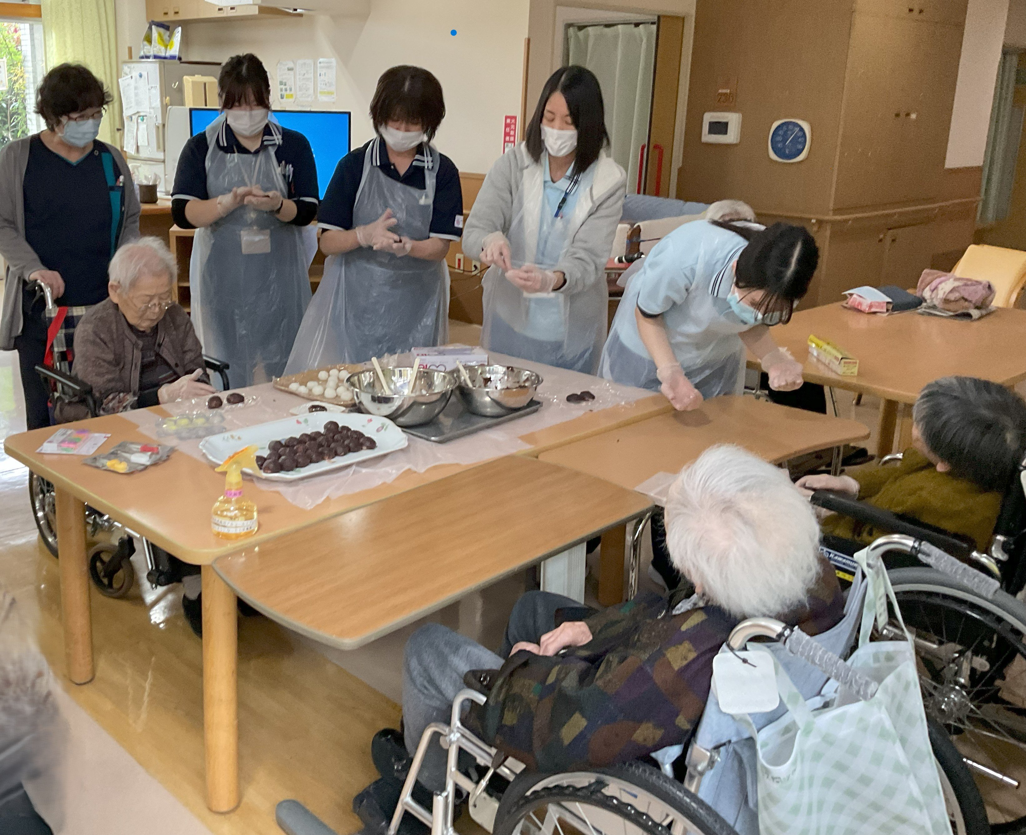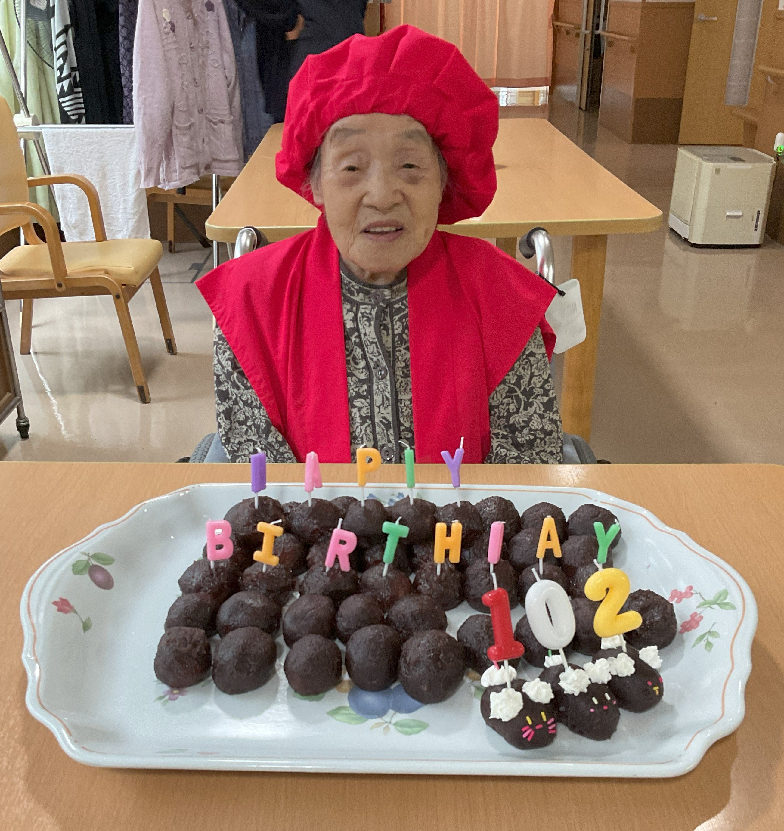 12月2日にりんどうユニットにて102歳になる利用者さんの誕生会を行ないました。おはぎが食べたいとのリクエストにお応えして、他利用者さんやたくさんの職員のお手伝いもあり、みんなでおはぎを作りました。プレゼントや記念撮影なども行い、とても喜んで頂けた誕生会でした。