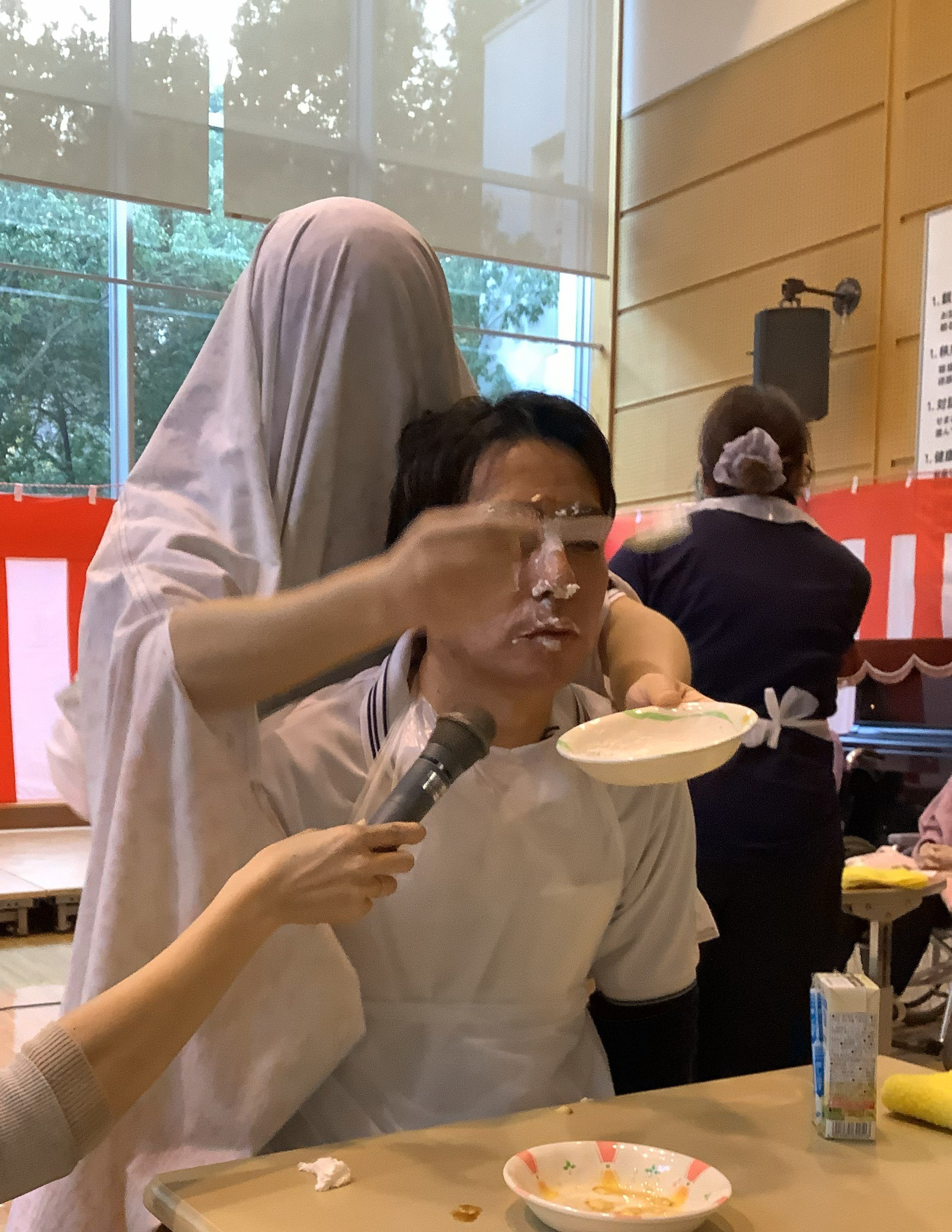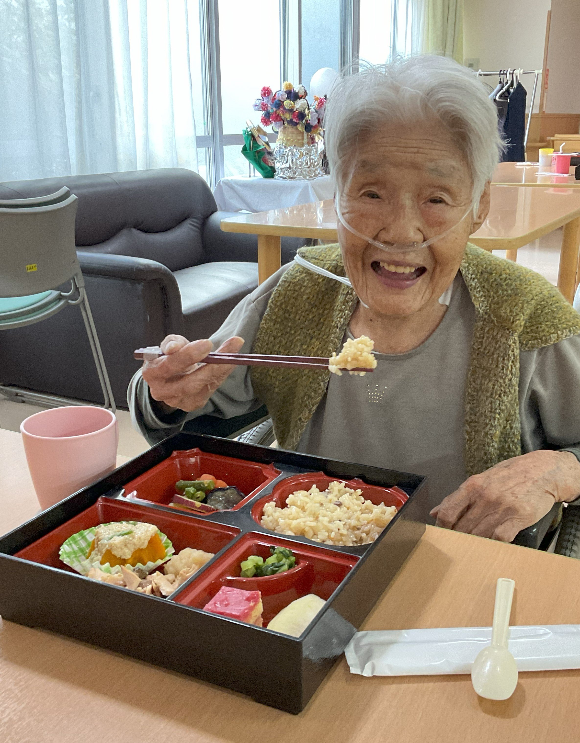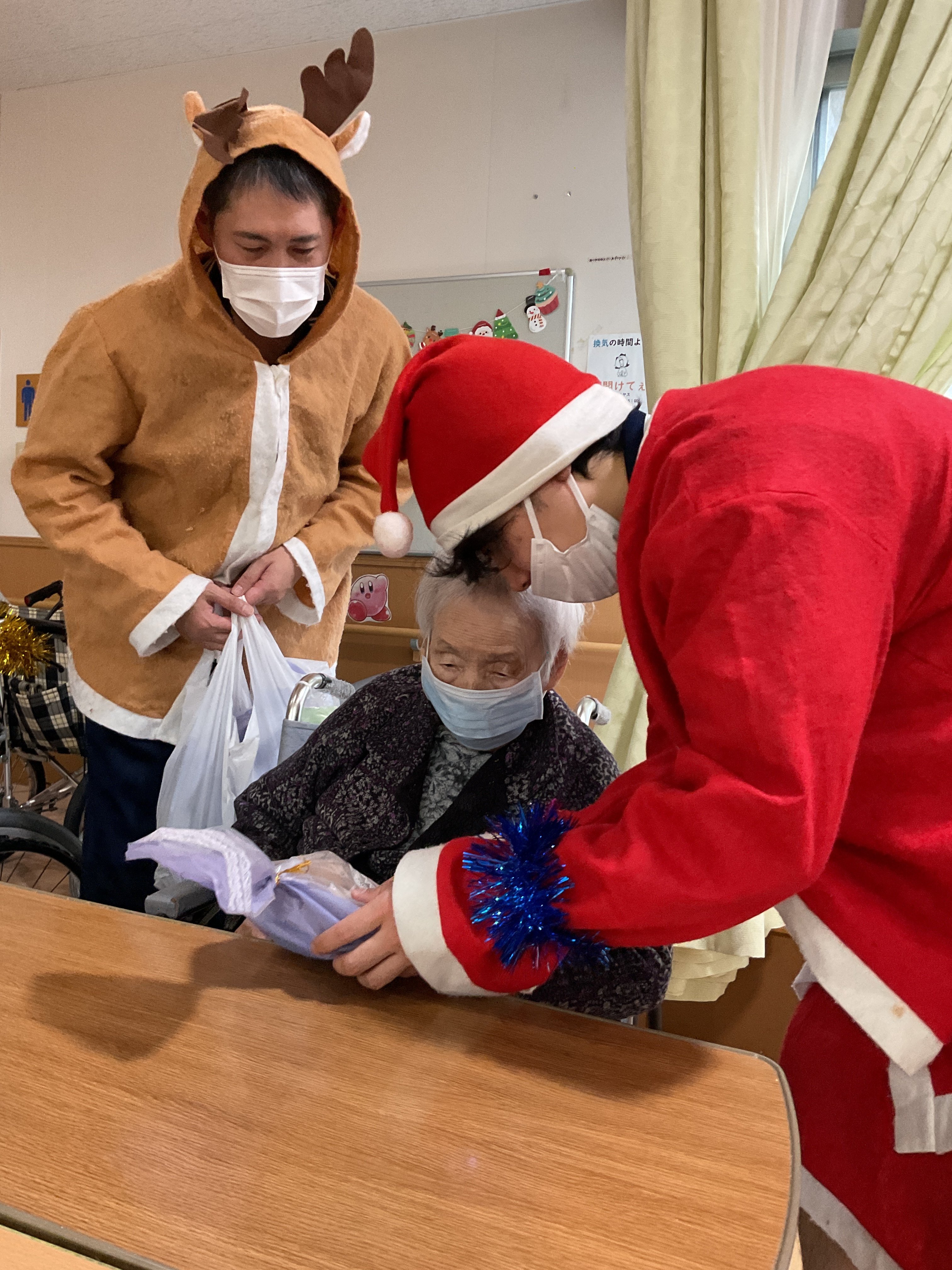 昼食には豪華な松花堂弁当を召し上がっていただき、その後忘年会を開催しました。ボランティアの方をお招きしてバンド演奏を行い、さらに職員によるストッキング相撲や二人羽織で大いに盛り上がりました。忘年会終了後には各ユニットへ戻り、職員から少し早めのクリスマスプレゼントをお渡ししました。
