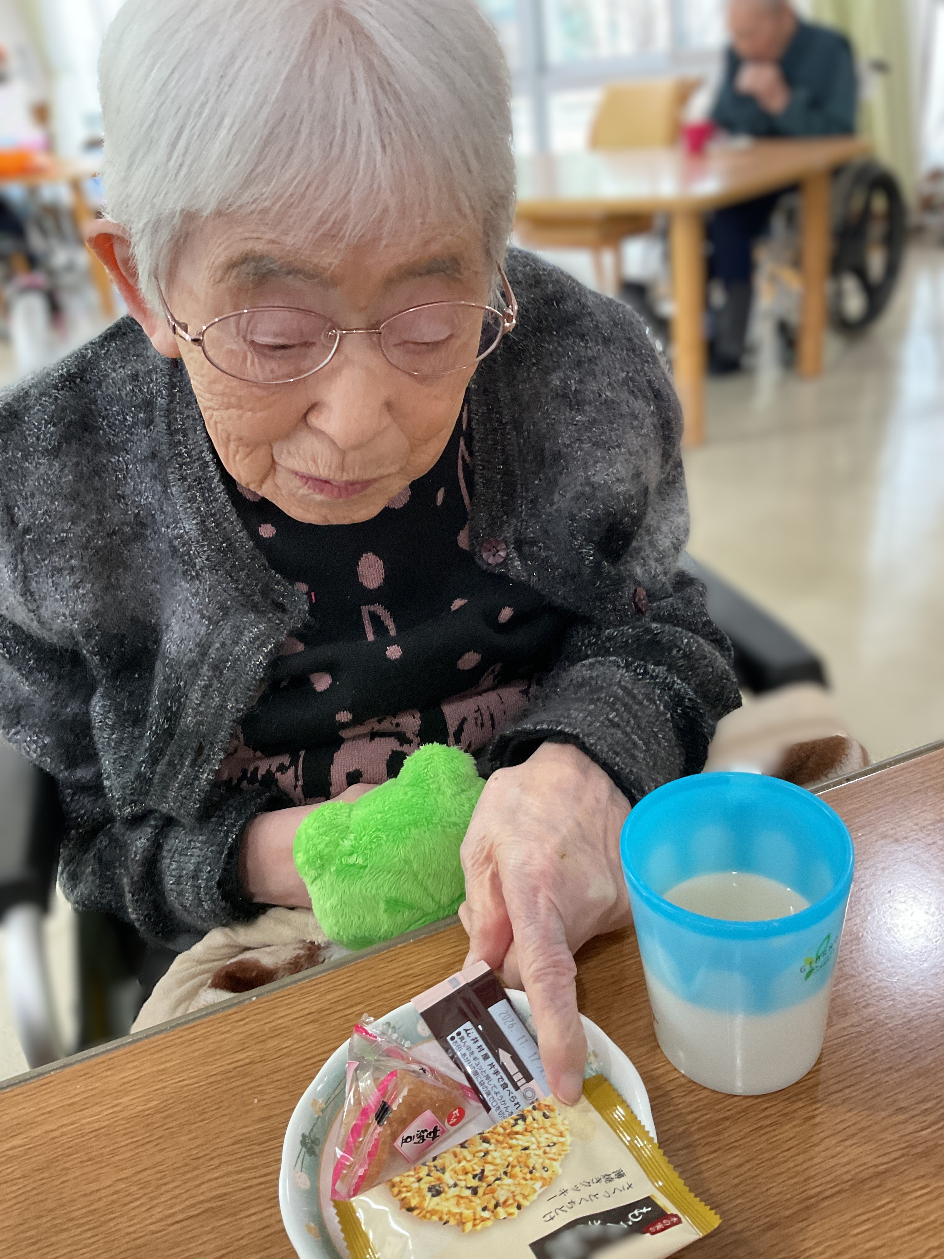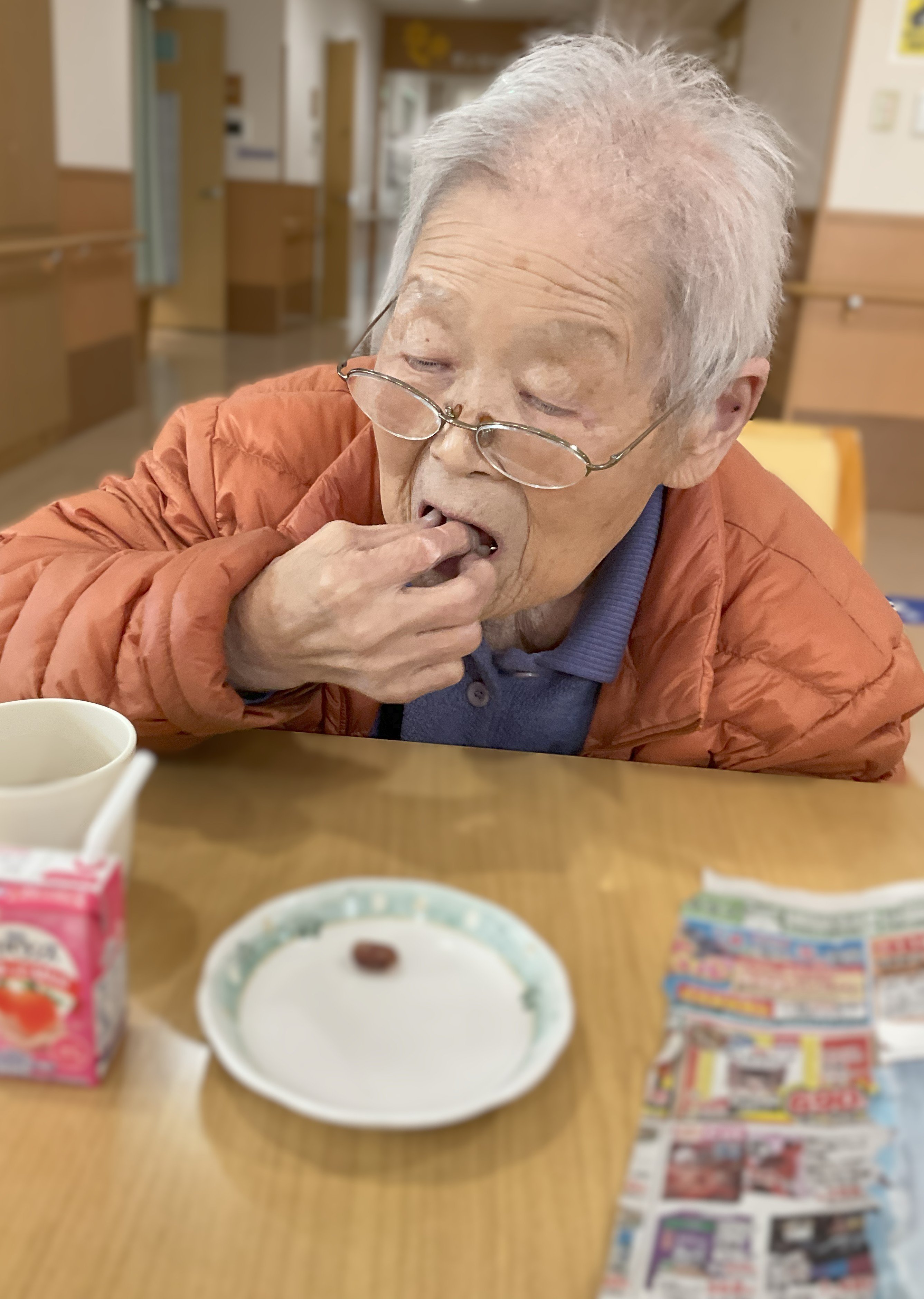 先日、節分も近かったことから梅昆布茶とお菓子を頂きました。なかなか梅昆布茶を飲まない利用者さんからは「美味しいよ」とお言葉を頂き、一緒に食べた甘納豆を一口ほおばると、思わず笑顔がこぼれていました。「昔よく食べたんだよ」「懐かしい味だね」など、自然と会話も弾み、ほっと心が温まるひとときとなりました。