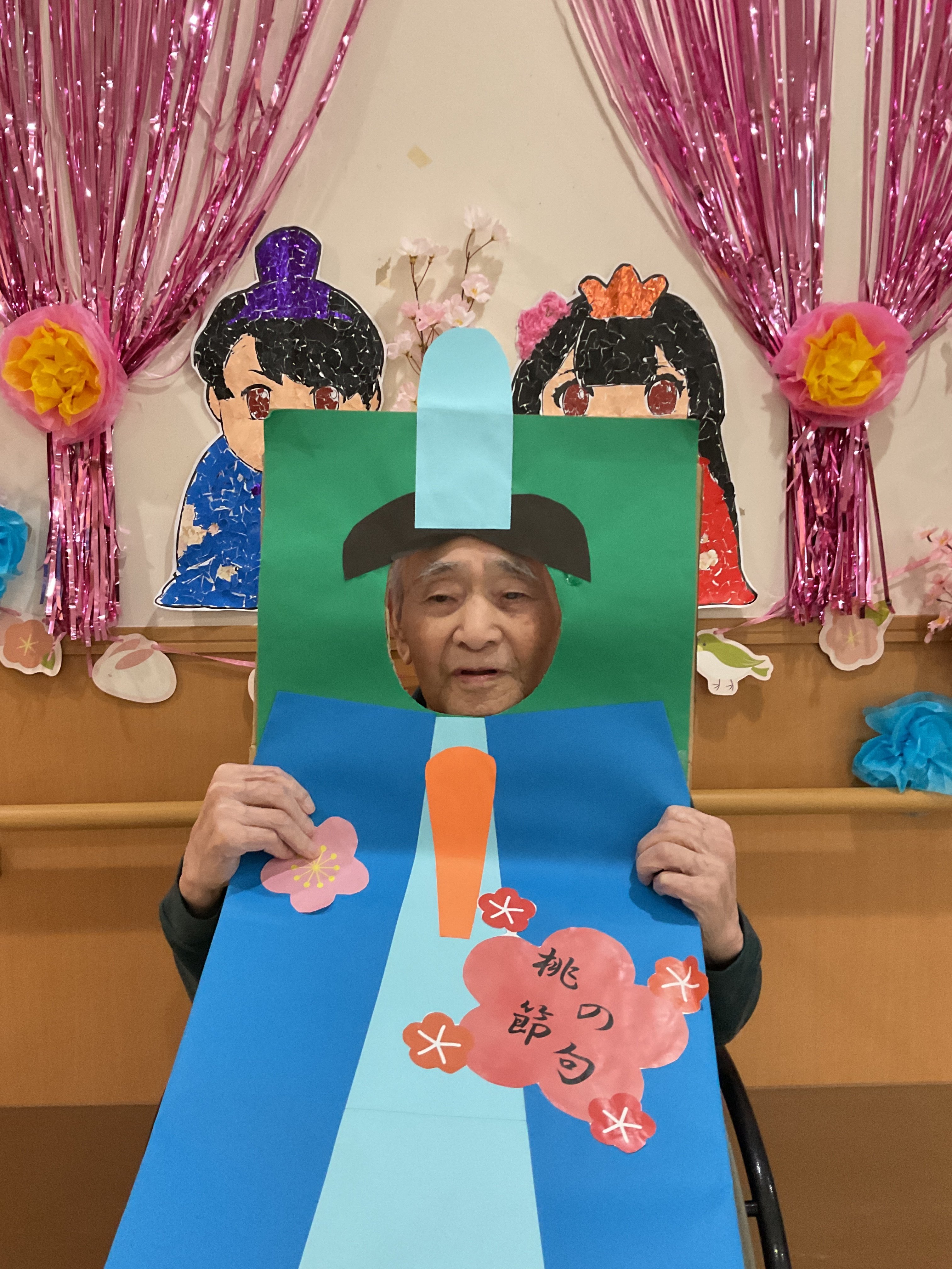 こんにちは、すいせん・りんどうユニットです。3月3日に雛祭り行事にて飾り付けした背景を背にしてお内裏様とお雛様の顔はめパネルと一緒に写真撮影をしました。また、練り切りと甘酒を提供し、雛祭りの歌を流しながら召し上がって頂きました。写真撮影時は「恥ずかしいね」と話しながらも笑顔で撮って下さり、甘酒を召し上がられた際は「甘くて美味しいね」とご好評の声を頂きました。今後も行事を通して季節感を感じて頂き、有意義な時間を過ごして頂ける様に企画していきたいです。