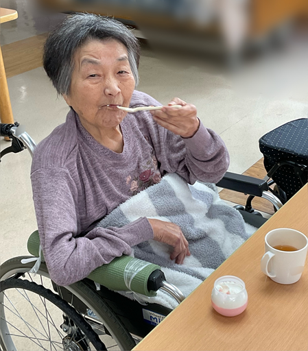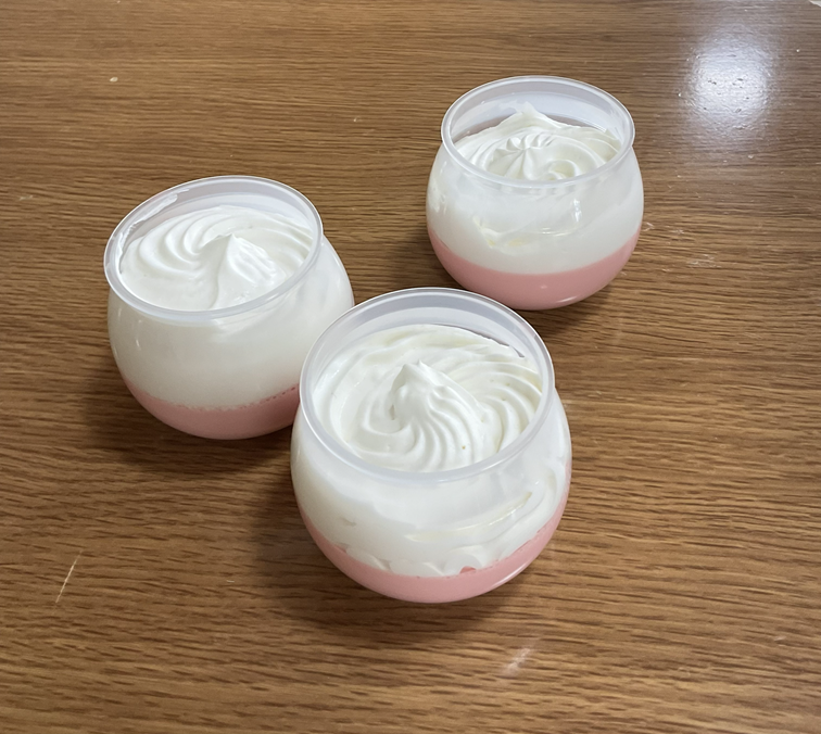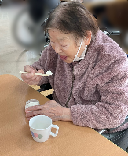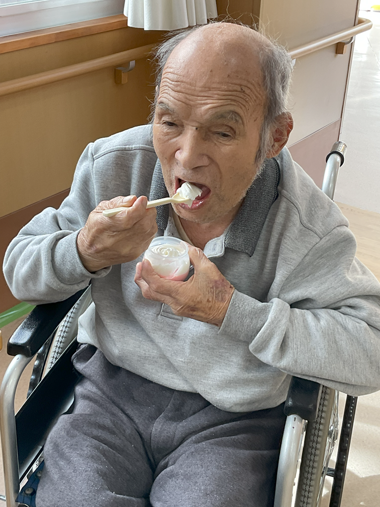 イチゴプリンの上にたっぷりのクリームが乗った見た目に、利用者さんも「こんなの初めて見た」と物珍し気に見られていましたが、